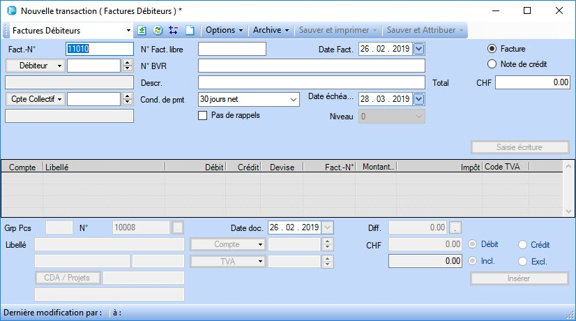 a) Entrez un montant négatif dans la première écriture. Le bouton radio bascule automatiquement du paramètre Facture sur Note de crédit et le montant est affiché en rouge.