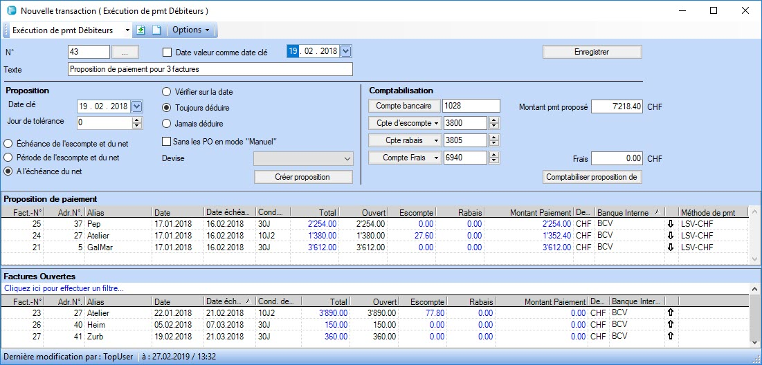 · Période de l'escompte et du net – Topal propose la facture pour déduire l’escompte tout au long de la période d’escompte (date facture à date clé) et sinon de nouveau à l’échéance du net