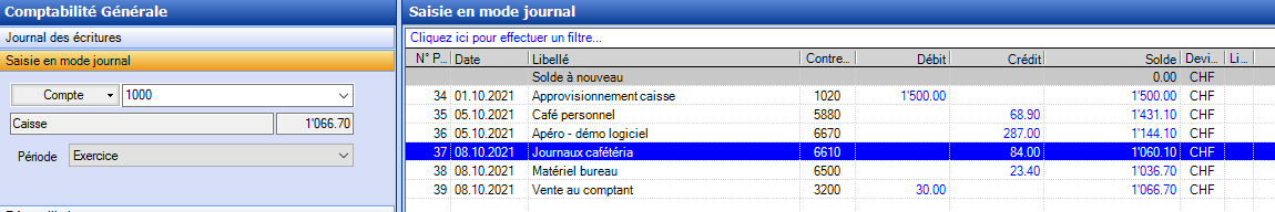 Contrairement à la table de la comptabilité générale, la table de la saisie en mode journal ne contient que les écritures du compte de liquidités en cours. Elle offre en quelque sorte un extrait de compte de la caisse ou du compte bancaire/postal en cours d’utilisation. La fonction Période, qui permet de charger dans la liste uniquement les entrées d'un mois, est utile pour vérifier les livres de caisse ou les relevés de compte. Par défaut, la table affiche l’exercice complet.
