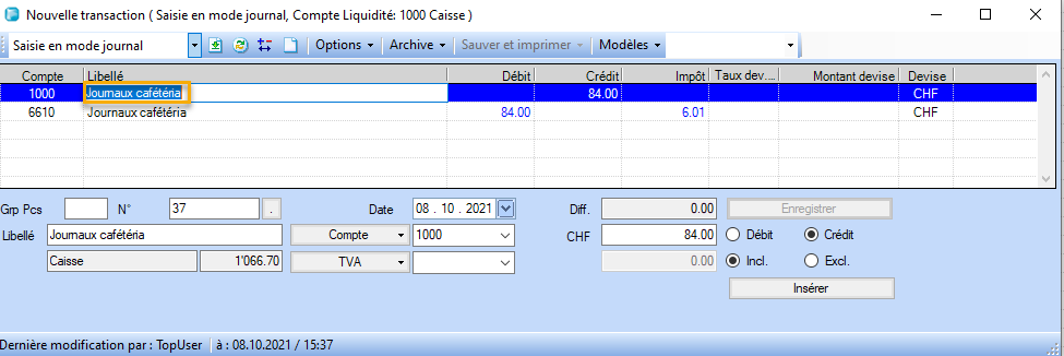 Les écritures du compte de caisse sélectionné apparaissent dans la liste en arrière-plan. Un double-clic sur une position la charge en mode modification dans la fenêtre Nouvelle transaction. Après modification d’une ligne de l’écriture, vous êtes demandé si le texte de la contrepartie doit également être modifié.