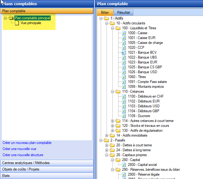 Lorsque vous créez un nouveau mandat, vous commencez certainement à partir d'un modèle de plan comptable, pour le modifier ensuite dans la section Plan comptable. Dans la zone de sélection à gauche se trouve l’icône du plan comptable principal ainsi que de la première vue enregistrée. Au besoin, des plans comptables secondaires peuvent être créés.