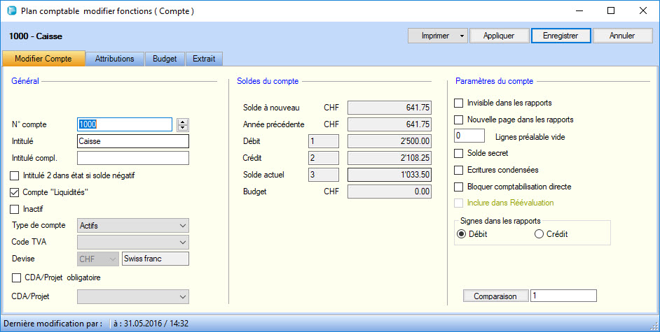 La fenêtre de saisie et d’édition des comptes est composée de quatre onglets : Modifier compte, Attributions, Budget et Extrait. Le bouton Imprimer propose une liste avec différents extraits de relevé de compte. La description des 4 onglets se trouve dans les chapitres suivants.