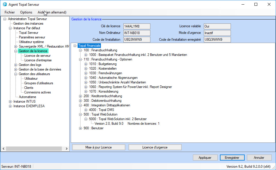 Figure 1 : Topal Server Agent  - Gestion de la licence