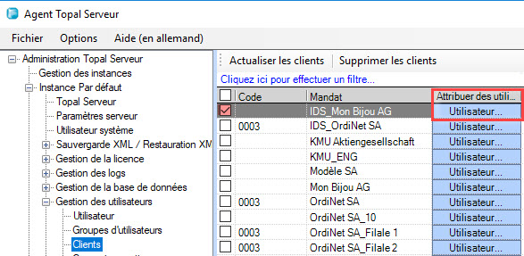 L'affectation des mandats à un compte d'utilisateur s'effectue normalement directement via le nœud [Utilisateur > Affecter des clients > bouton Clients]. Mais vous avez aussi la possibilité de le faire ici via [Clients > bouton Utilisateur] (Figure 1).