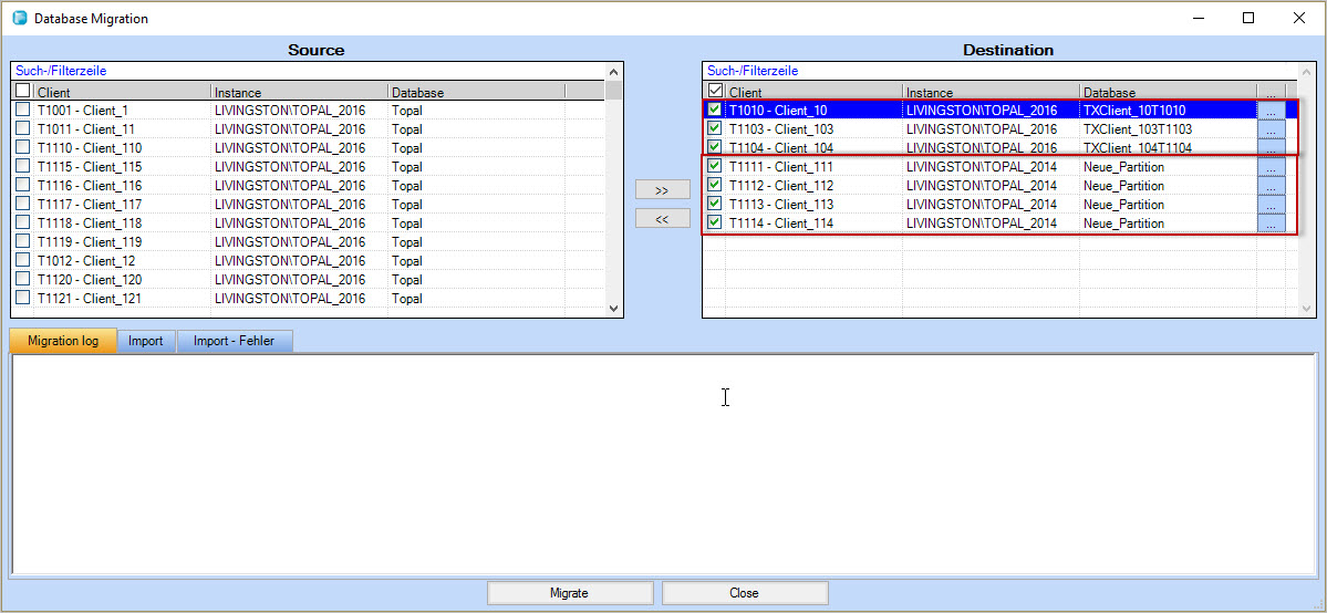 Comme vous pouvez le voir, dans le cas 1, 3 bases de données distinctes, par client, sont créées sur SQL Server Topal_2016. Dans le cas 2, 4 clients sont stockés ensemble dans la même base de données (nouvelle partition) sur le SQL Server Topal_2014. Pendant la migration, vous avez toujours la possibilité d'affecter des clients (bases de données) d'un serveur SQL à un autre.