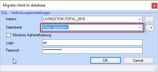 Indiquez s’il faut créer les clients dans une base de données distincte. Pour ce faire, sélectionnez <Nouvelle DB> dans le champ Base de données et appuyez sur [OK]. Vos paramètres sont stockés dans le grid Destination