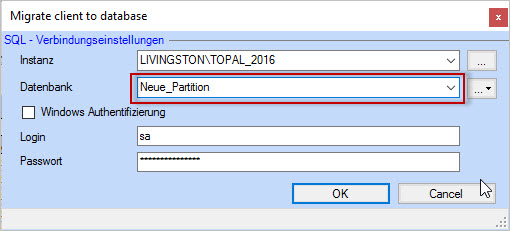 Si plusieurs clients doivent être regroupés dans une partition, vous pouvez spécifier un nom pour votre nouvelle partition dans le champ Base de données (p. ex. nouvelle partition ; Figure 2). Appuyez ensuite sur [OK] pour transférer les paramètres dans le grid de la zone Destination.