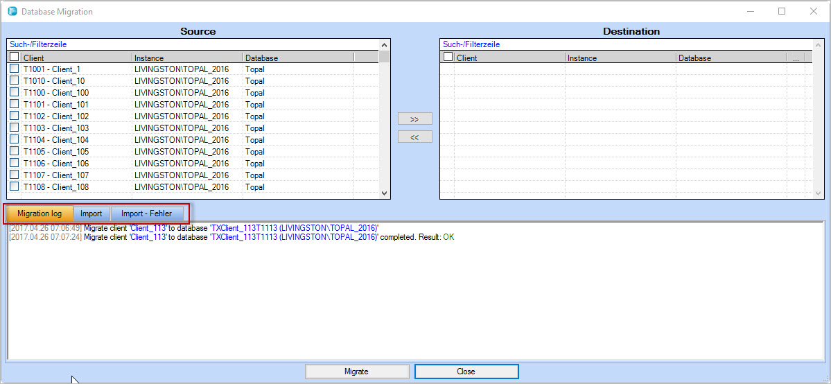 via [Server Agent > Gestion de base de données > Outils > Migration client]. Topal répertorie tous les mandants disponibles dans le système dans une liste. Le nom du client, l'instance SQL Server et le nom de la base de données sont affichés, dans lequel le client correspondant est stocké. Sélectionnez les clients que vous souhaitez migrer à l’aide de la case à cocher de la zone Source. Sélectionnez ensuite le bouton [>>] pour déplacer les clients vers le système cible Destination. Appuyez sur le bouton [>>] pour  ouvrir la boîte de dialogue de la figure 2. Une configuration peut également être annulée : sélectionnez le client dans le grid Destination et appuyez sur le bouton [<<] pour l’enlever. Mais vous avez également la possibilité d'effectuer des réglages via le bouton [...] de la table Destination.