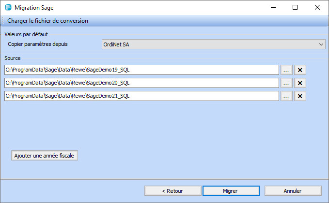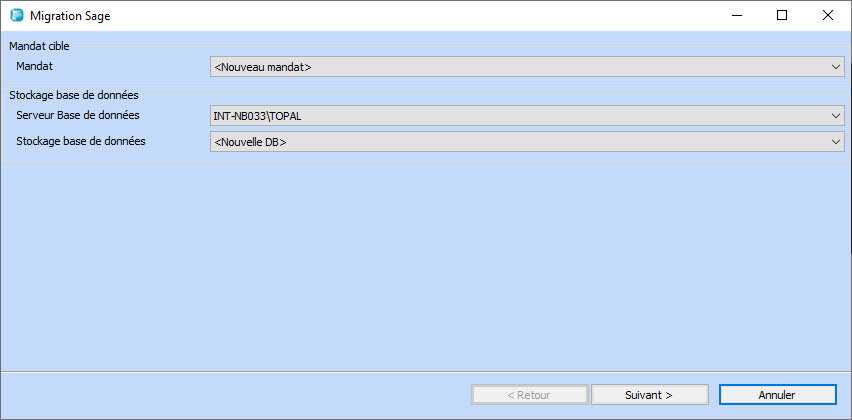 • Indication, si une nouvelle migration Sage (première migration) doit être effectuée ou si un exercice supplémentaire doit être migré dans un mandat existant.