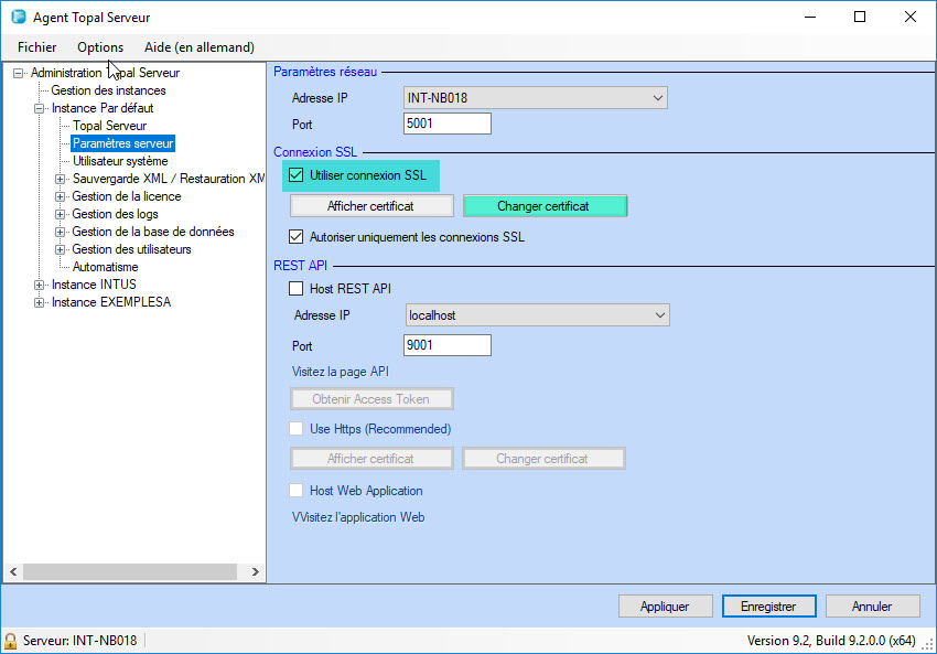 Le certificat de serveur est installé via Topal Server Agent. Comme déjà mentionné, Topal vous permet de créer plusieurs instances. Par conséquent, lors de l'utilisation de certificats, le certificat approprié doit être installé pour chaque instance de serveur. Voici les étapes à suivre :