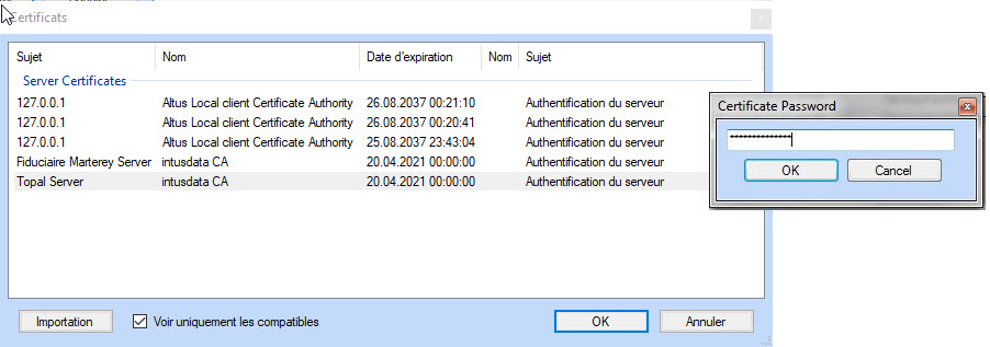 Une connexion sécurisée des utilisateurs au Topal Server nécessite des certificats. La création du serveur et des certificats d'utilisateur peut être générée par un organisme officiel (SwissSign), par Topal Solutions SA ou par vous-même.