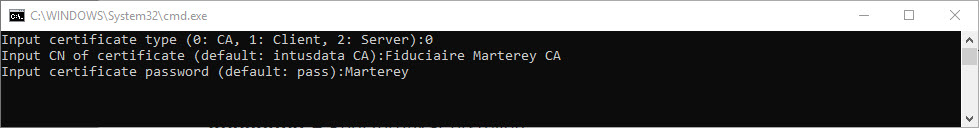 2. Sélectionnez 0 pour CA (Autorité de certification), ainsi que le nom de votre société (Exemple : Fiduciaire Marterey CA) et le mot de passe (Figure 1) :