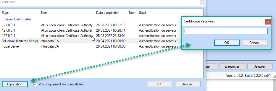 Figure 4 : Importation de certificats de serveur pour une ou plusieurs instances Topal - entrée du mot de passe du certificat de serveur