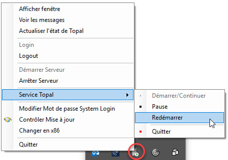 Si le service Topal Server doit être arrêté ou démarré, cela peut être réalisé via le menu contextuel sur l'icône Topal Server Agent correspondante :