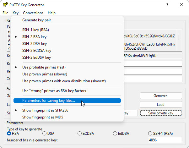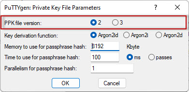 Paramètres de la version PPK File de Puttygen