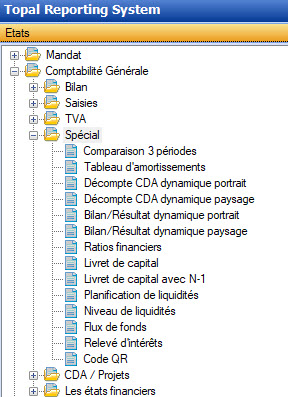 Avec une licence pour le module Topal Reporting System, les rapports spéciaux ci-dessous sont disponibles. Spécial est un sous-domaine du [Topal Reporting System > Comptabilité générale]. Les états divers sont générés avec des informations prédéfinies issues des données de base. Aucune écriture n'est passée pour les données exploitées, telles que les intérêts, l'amortissement pré-budgété ou les parts de profit. Les états ne sont générés qu’à titre informatif.