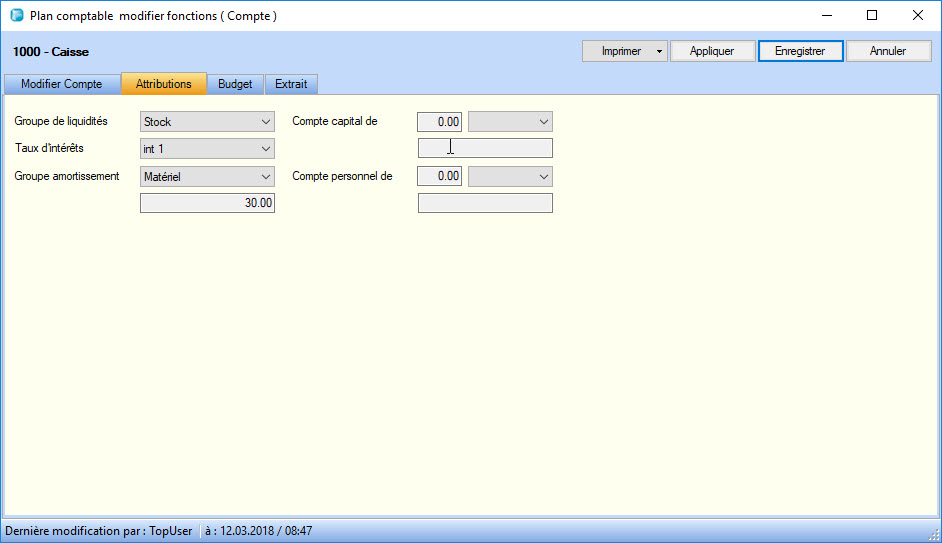 Le tableau d'amortissement évalue les immobilisations. Les groupes d’amortissement et leurs taux se définissent dans la table Liste des amortissements du module Données de base. (p.ex. le groupe Véhicules avec un taux d’amortissement de 30%). Les groupes d’amortissement doivent être enregistrés dans l’onglet Attributions des propriétés de comptes : un double-clic sur le compte concerné ouvre, la boîte de dialogue Plan comptable modifier fonctions. Les comptes avec une affectation sont affichés dans l'état. En activant la case à cocher Amortissement planifié dans les options d'état, vous décidez si les écritures d'amortissement planifiées ou effectivement comptabilisées sont livrées selon le taux d'amortissement défini.