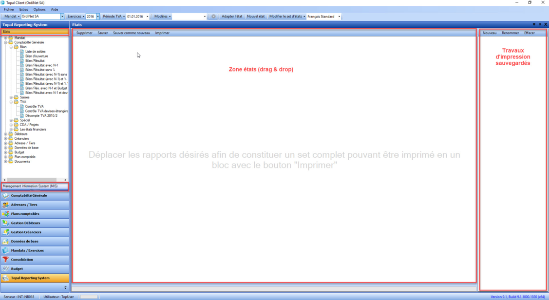 Le module [Topal Reporting System] contient les deux sous-modules [États] et [Management Information System (MIS)]. Ces modules sont liés étroitement avec la gestion et l'adaptation des rapports existants, ainsi que la création de nouveaux rapports. Le Topal Reporting System fournit son propre éditeur de rapports, qui permet à un utilisateur de créer et de modifier facilement des rapports.