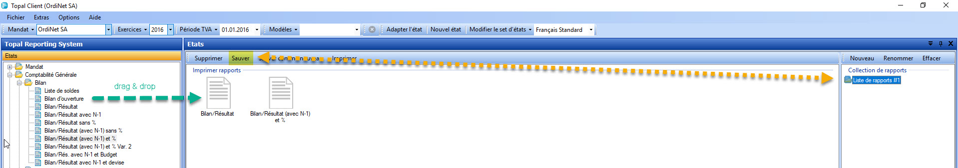 Souhaitez-vous imprimer plusieurs rapports dans un ordre chronologique en numérotant les pages consécutivement? Glisser-déplacer (drag & drop) les états dans l'ordre chronologique dans lequel ils doivent être imprimés dans la zone d'état. Les états ainsi déplacés sont affichés sous forme de vignette. Sélectionnez ensuite la commande Imprimer dans l'en-tête de l'espace de travail pour imprimer le set de rapports. Topal imprimera le travail en fonction de l'ordre dans lequel il a été créé. Les documents imprimés sont marqués d'un symbole approprié. Un set de rapports peut être sauvegardé avec la commande [Enregistrer sous] dans la barre d'en-tête sous un nom spécifique. Cette Collection de rapports reste disponible dans la zone droite de la table des états et peut être consultée ou réimprimée à une date ultérieure.