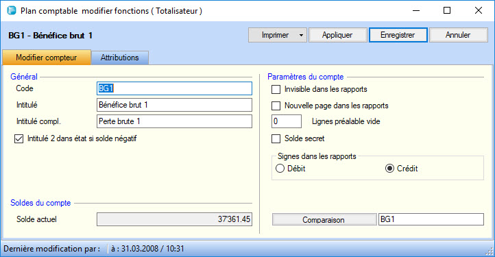 Cochez cette case, si vous désirez qu’un totalisateur qui affiche généralement un solde négatif soit imprimé sans le signe moins (-) dans les états, ou un totalisateur qui additionne les charges soit imprimé avec un signe négatif. Cette fonction n’a aucune influence sur le calcul des sommes, elle n’est là qu’à des fins visuelles.