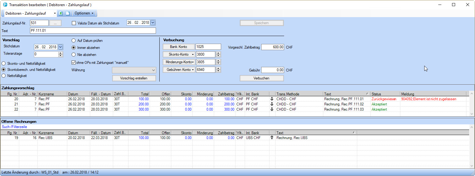 Retirez la facture erronée de la proposition de paiement et sauvegardez-la. Le montant du paiement est ajusté en conséquence.