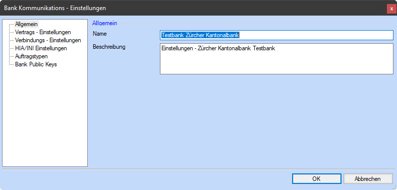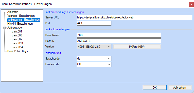 Die Verbindngs - Einstellungen reflektieren die Einstellungen für die Verbindung auf den Bank Server.