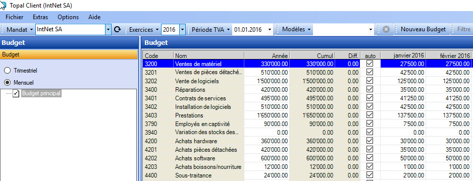 Le module Budget de Topal vous aide à saisir des budgets mensuels et trimestriels pour les comptes de votre choix. Le budget par défaut (modèle) comprend généralement les comptes de résultat. Vous pouvez également créer d'autres budgets. Selon le budget sélectionné dans la zone de sélection de gauche, les comptes correspondants apparaissent dans la liste (Figure 1). Lors de la saisie des valeurs de budget, vous travaillez directement dans la liste, de la même manière que lors du traitement des données de base.