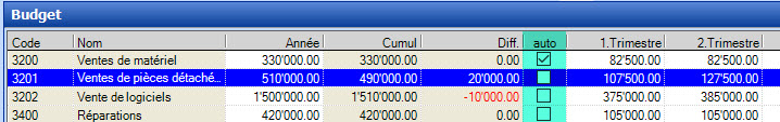 Si la colonne auto est activée (Figure 2), le montant est réparti uniformément sur les trimestres ou les mois dès que vous entrez un budget annuel pour un compte dans la liste. Désactivez cette colonne si vous ne souhaitez pas répartir le budget annuel sur des périodes. Si vous corrigez les valeurs trimestrielles ou mensuelles, le total des valeurs périodiques individuelles apparaît dans la colonne Cumul. La colonne Diff. montre l'écart entre le cumul et le budget annuel, de sorte que vous ayez toujours une vue d’ensemble pour savoir si votre budgétisation correspond au budget annuel défini.