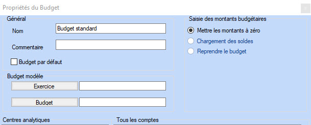 Ces options sont significatives si vous transférez un budget existant afin que ses valeurs et la sélection des comptes puissent être transférées au nouveau budget. Indiquez ici si les soldes actuelles des comptes ou les valeurs de budget existantes doivent être transférées ou si toutes les valeurs doivent être mises à zéro.