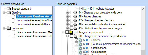 Les comptes sélectionnés sont ceux qui doivent être budgétisés. Si vous avez sélectionné des centres de coûts sur le côté gauche, les comptes correspondants leur sont affectés, sinon le nombre de comptes apparaît après le nom de budget.
