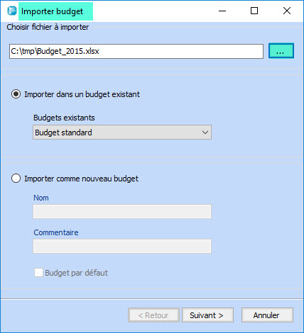 Une importation comme nouveau budget avec des centres de coûts est réalisée de la même manière que l’importation dans un budget existant, décrite ci-dessus. Sélectionnez le bouton radio correspondant. Saisissez un nom approprié pour le nouveau budget et suivez ensuite l'assistant d’importation.