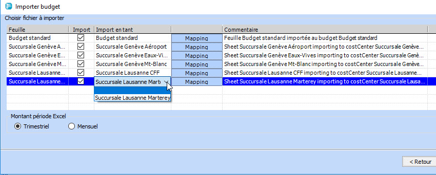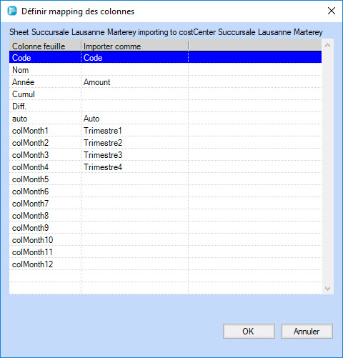 Si un budget existant est exporté à partir de Topal, les données budgétaires ajustées dans Excel et importées à nouveau, aucun Mapping supplémentaire n'est nécessaire. Cependant, si des colonnes supplémentaires sont ajoutées ou supprimées dans Excel, un mapping manuel (Figure 8) des colonnes devient nécessaire. Pour ce faire, cliquez sur le bouton [Mapping] que l’on peut voir dans la grille. Un Mapping peut être fait individuellement pour chaque centre de coûts.