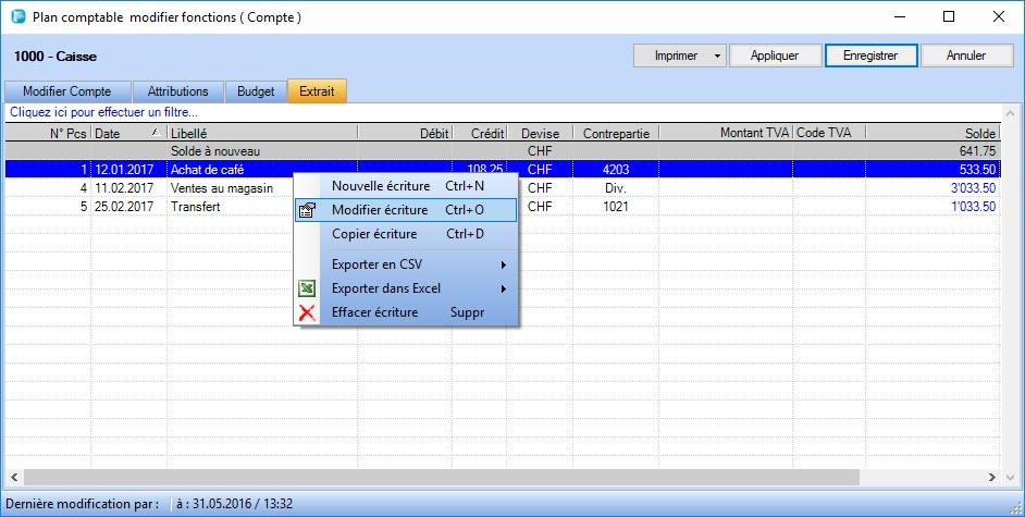 Cet onglet affiche l’extrait du compte sélectionné.  Le menu contextuel vous permet de modifier l’écriture, d’accéder à la fenêtre de saisie d’écritures Nouvelle transaction ou de réorganiser les colonnes.