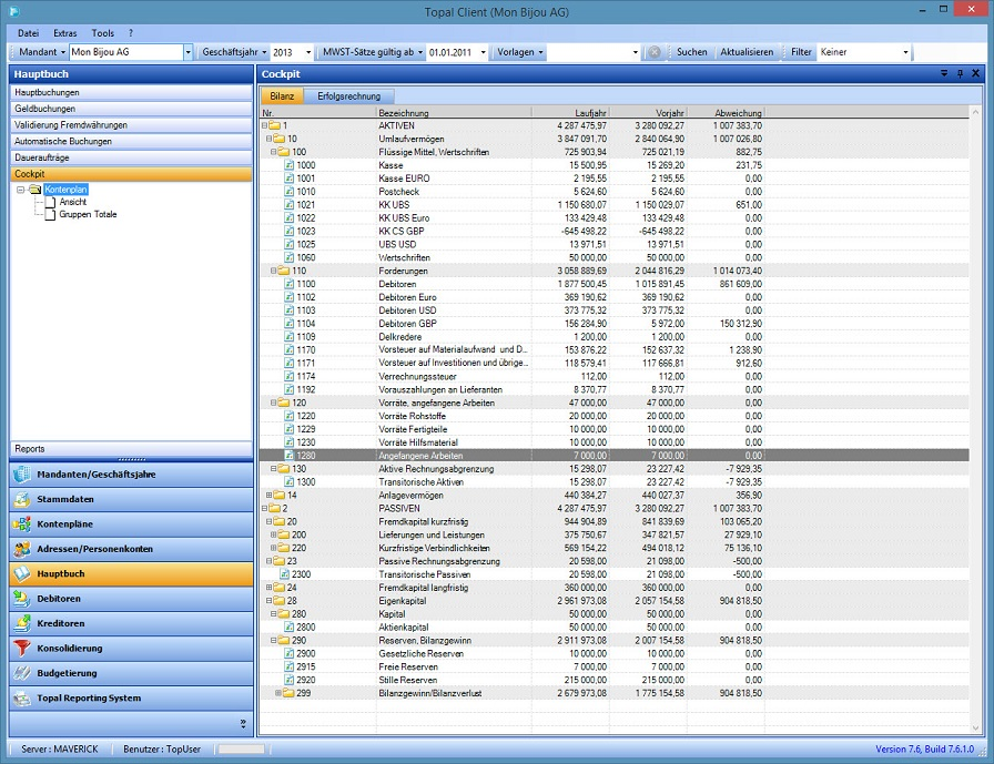 Das Cockpit ist Teil des Haupbuches und kann via [Modulnavigation - Hauptbuch | Submenü - Cockpit] aufgerufen werden. Innerhalb des Cockpits stehen Ihnen zwei Navigationsbereiche zur Verfügung. Auf der linken Seite sind die gewünschten Ansichten ersichtlich, im Hauptbereich ist das Cockpit dargestellt. Die wahl der Cockpitansicht der Bilanz resp. Erfolgsrechnung ist via [Tab - Bilanz] oder [Tab - Erfogsrechnung] zu erreichen. Wie im Kontenplan lässt sich die Ansicht der verschiedenen Gruppen Ihren Wünschen entsprechend einzurichten. Gruppen lassen sich öffnen oder schliessen, um entsprechend Detailinformationen von Kontengruppen zu visualisieren.