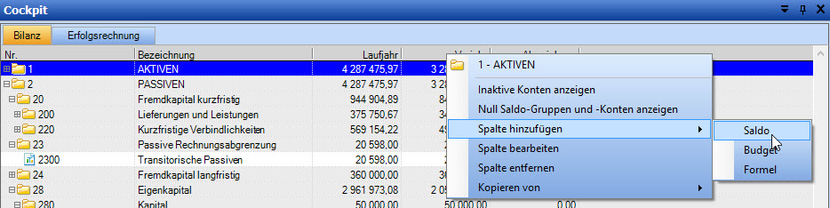 Via Kontextmenü im Spaltenkopf können Saldo-, Budget und Formelspalten hinzugefügt werden.