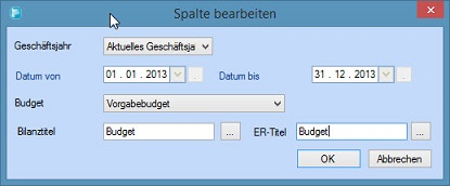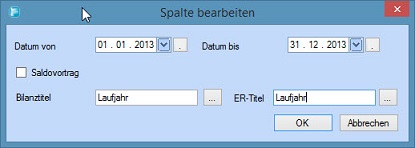 Die Angabe der Periode sowie die Bezeichnung der Spaltentitel lässt sich in folgendem Dialog vorgeben. Hierzu sind das gewünschte Geschäftsjahr und Titel der Spalten zu definieren.