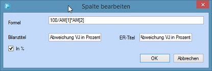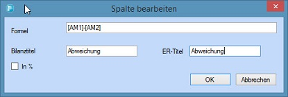 Formelspalten sind zum Berechnen von Abweichungen und /oder Prozentanteile verschiedener Saldo- bzw. Budgetspalten. Im Feld "Formel" werden die zur Berechnung notwendigen Parameter eingegeben. Für die Anzeige sind die jeweiligen Spalten wie folgt anzugeben.