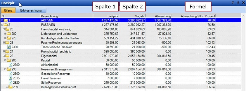 Abbildung 8: Cockpit - Spalte 1 "Laufjahr", Spalte 2 "Vorjahr" und Formel "Abweichung VJ in Prozent"