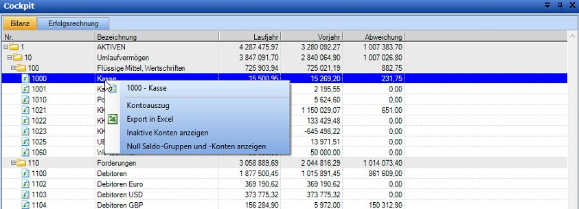 Das Cockpit ermöglicht es Ihnen Konten unter die Lupe zu nehmen oder zu bearbeiten. Per Doppelklick oder via Kontextmenü [Kontoauszug] auf einem entsprechenden Konto lässt sich