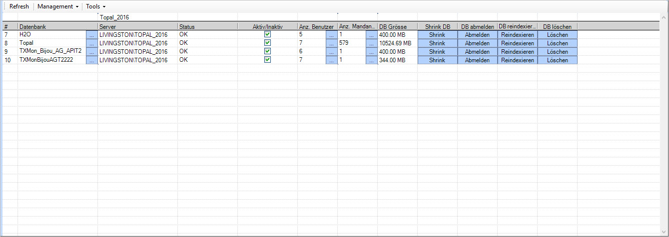 Dient dem aktivieren oder inaktivieren einer Datenbank. Ist die Datenbank inaktiv, werden die Mandaten dieser DB nicht gelesen resp. in Topal angezeigt.