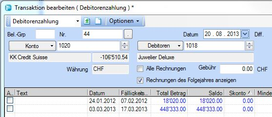 Wer mit dem elektronischen Zahlungsverkehr arbeitet, wird Debitorenzahlungen in der Regel automatisch im Eingabemodus ESR-Zahlungen einlesen und verbuchen. Aber auch das manuelle Verbuchen einer Rechnung ist in Topal recht komfortabel: Sobald Sie ein Debitorenkonto ausgewählt haben, erscheinen die zugehörigen offenen Rechnungen.
