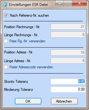 Einzahlungsscheinen mit. Dabei geben Sie an, an welcher Position der ESR - Nummer die Rechnungsnummer beginnt und wieviele Stellen diese umfasst ebenso wie die Position und Länge der
