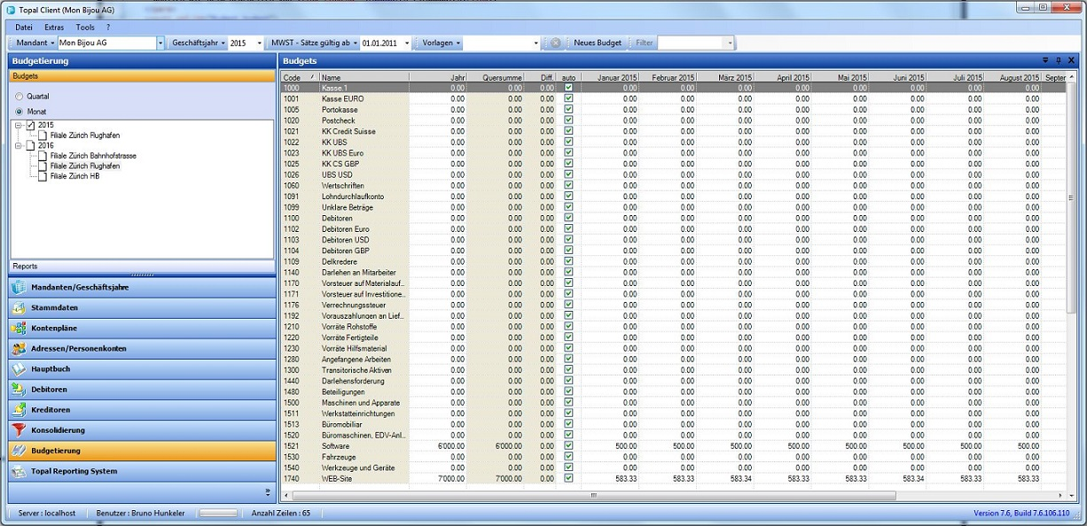Topal unterstützt Sie beim Erfassen von Monats- und Quartalsbudgets für beliebige Sets von Konten, die Sie sich individuell zusammenstellen können. Das Vorgabebudget umfasst in der Regel die Erfolgskonten. Daneben können Sie beliebige weitere Budgets erstellen. Je nachdem, welches Budget links im Auswahlbereich markiert wurde, erscheinen die entsprechenden Konten in der Liste (Abbildung 1). Beim Erfassen der Budgetwerte arbeiten Sie direkt in der Liste ähnlich wie beim Bearbeiten von Stammdaten.