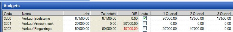 Sofern die Spalte auto aktiviert (Abbildung 2) ist, wird der Betrag gleichmässig auf die Quartale oder Monate verteilt, sobald Sie bei einem Konto in der Liste ein Jahresbudget eingeben. Deaktivieren Sie diese Spalte, wenn Sie die Beträge nicht regelmässig über die einzelnen Quartale/Monate verteilen möchten. Wenn Sie die Quartals- oder Monatswerte anpassen, erscheint in der Spalte Zeilentotal die Summe der einzelnen Periodenwerte. Die Spalte Differenz wiederum zeigt die Differenz zwischen Zeilentotal und Jahresbudget, so dass Sie immer im Überblick haben, ob Ihre Budgetierung mit dem gesetzten Jahresbudget übereinstimmt.