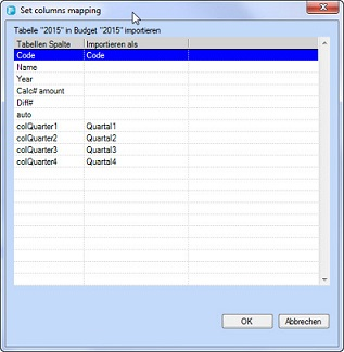 Wird ein existierendes Budget aus Topal exportiert, die Budgetdaten im Excel angepasst und wieder importiert, ist kein zusätzliches Mapping notwendig. Werden jedoch zusätzliche Spalten in Excel hinzugefügt oder entfernt, wird ein manuelles Mapping (Abbildung 8) der Spalten notwendig. Dies erreichen Sie durch anwählen des Button [Mapping], welcher im Grid ersichtlich ist. Ein Mapping kann für jede Kostenstelle individuell vorgenommen werden.