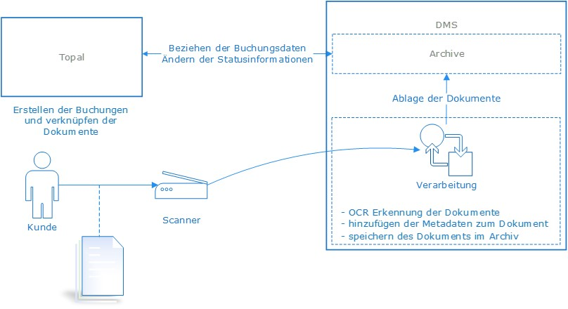 In diesem Fall werden Dokumente via OCR Erkennung vom entsprechenden DMS System gescannt, mit Metadaten versehen und im DMS gespeichert.