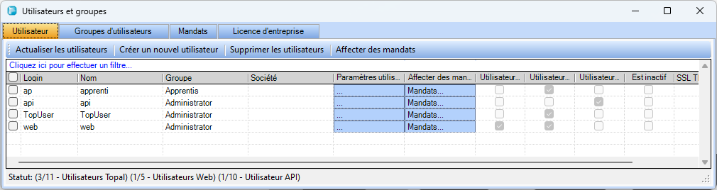 La gestion des utilisateurs de Topal suit le concept d'utilisateur / groupe d'utilisateurs. Ceci vous permet d'affecter un utilisateur à un groupe. Les groupes d'utilisateurs définissent les données qu'un utilisateur peut visualiser, modifier ou créer. Lorsqu'un nouvel utilisateur est créé, il est nécessaire de décider à quel groupe d'utilisateurs il devrait appartenir afin de pouvoir effectuer son travail en conséquence.