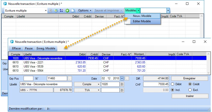 1. Ouvrez le dialogue Nouvelle Transaction en mode écriture multiple [Nouvelle écriture > Ecriture multiple] et sélectionnez [Modèles > Nouv. modèle].