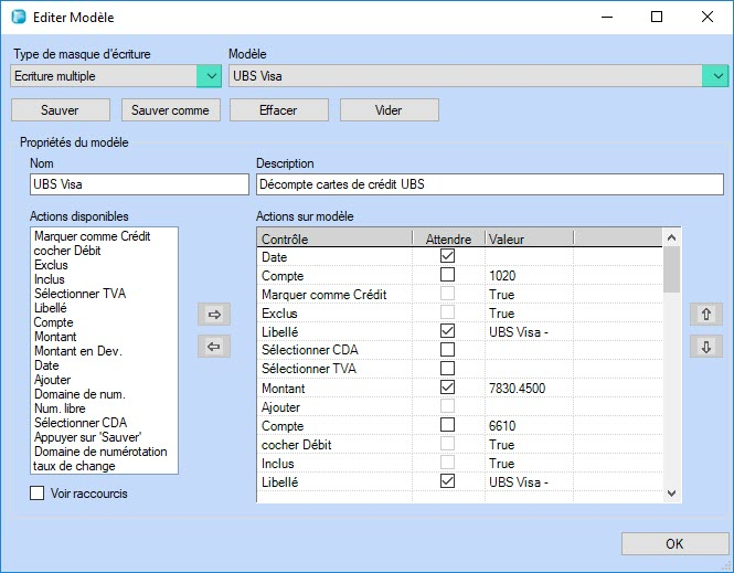 Les modèles enregistrés peuvent être modifiés ultérieurement à l'aide de la fonction [Modèle > Editer modèle] (Figure 2). Les modèles existants sont répertoriés par type d'écriture (écriture simple, écriture multiple ou saisie en mode journal). Les propriétés du modèle sélectionné, s'affichent dans la rubrique Actions sur modèle. La colonne ATTENDRE indique les champs (marqués d'une croix) où l'écriture automatique doit attendre la saisie d'une valeur variable.