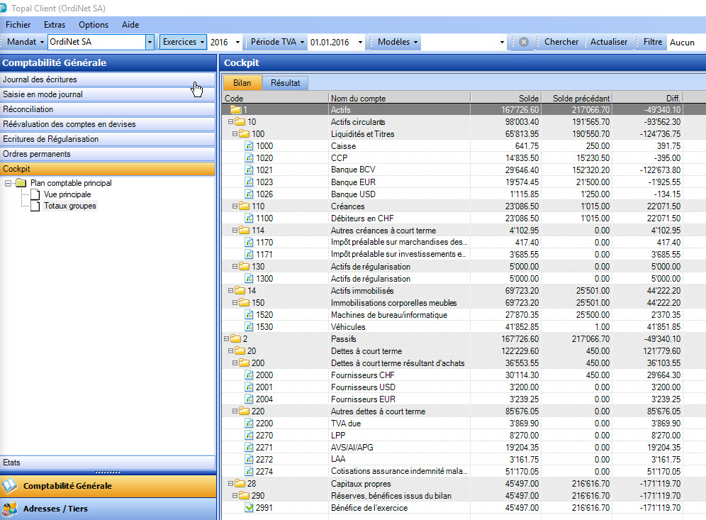 Le cockpit est accessible via [Comptabilité Générale > Cockpit]. Il est divisé en 2 zones. Sur le côté gauche se trouve une arborescence, avec les vues individuelles du plan comptable. La table elle-même représente le Cockpit. La touche TAB + les touches fléchées du pavé numérique permettent de passer d'une vue à l'autre des onglets Bilan et Résultat.